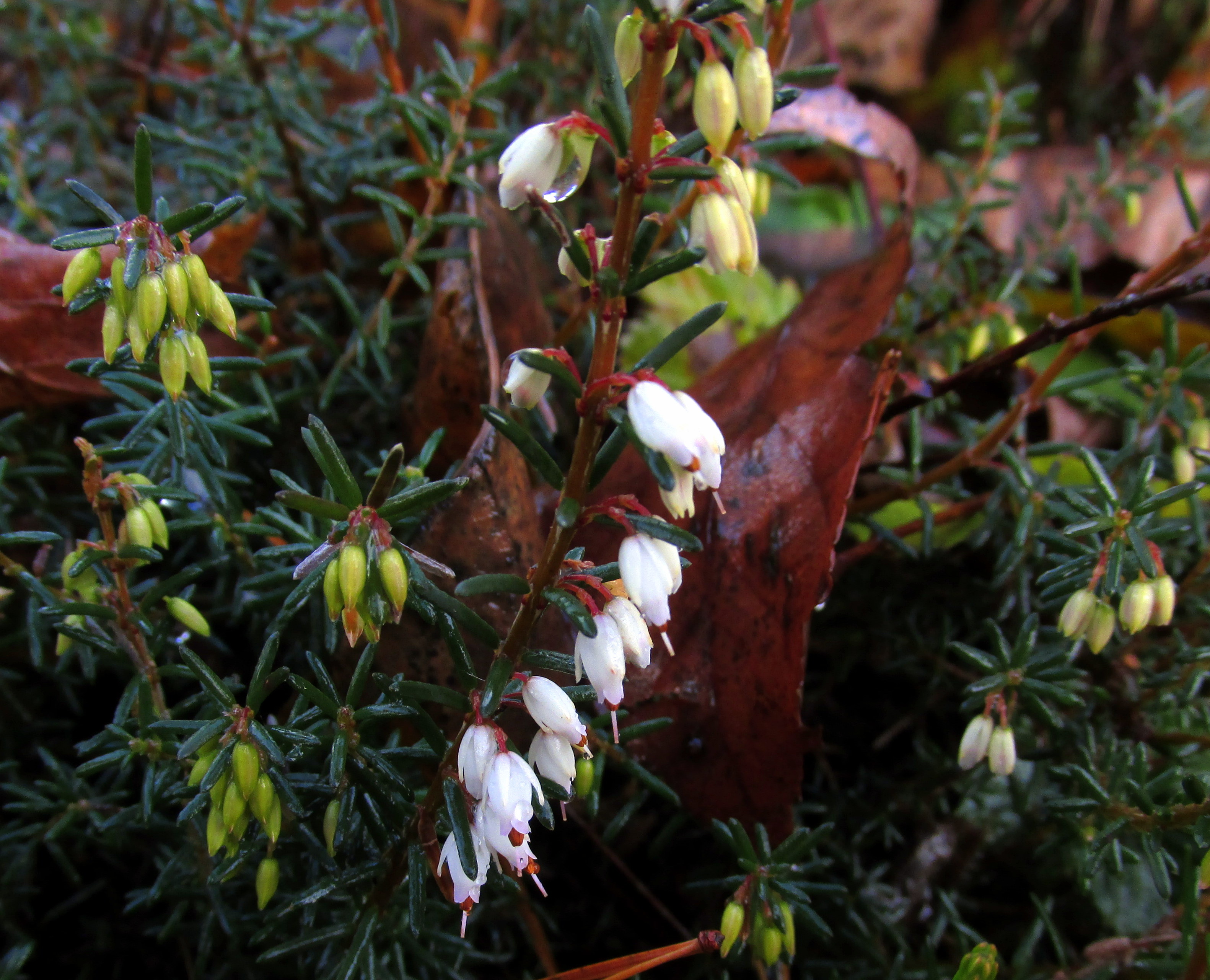 It’s fun looking at other people’s actual flower blooms, but although we don’t have any snow cover yet — quite unusual — and it’s been unseasonably warm, with high temps for the past week ranging from 39 to 57F, which is 12F degrees above normal, and lows from 21 to 42F, 14F degrees above normal, there is really very little in bloom here now outside — except the heather!